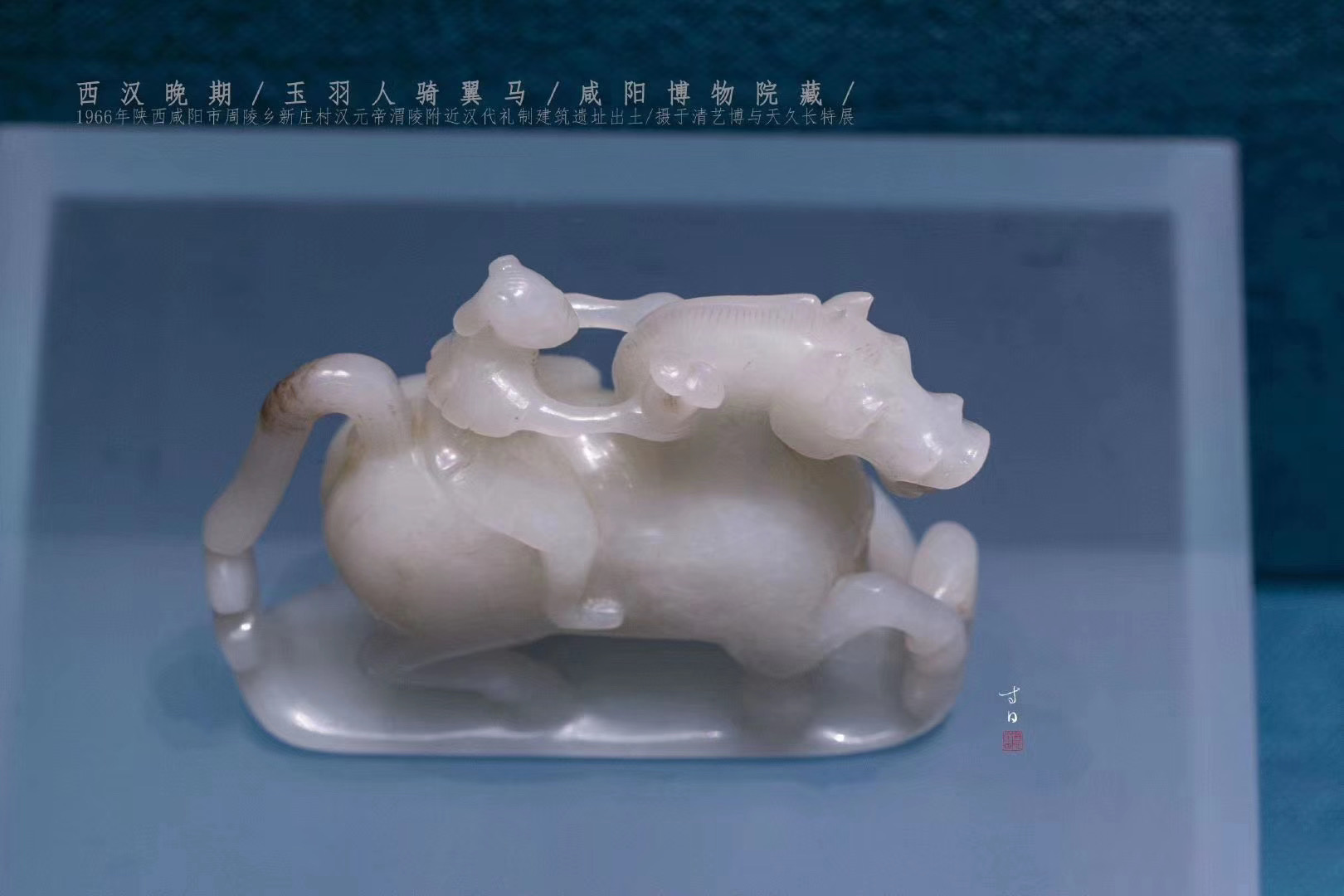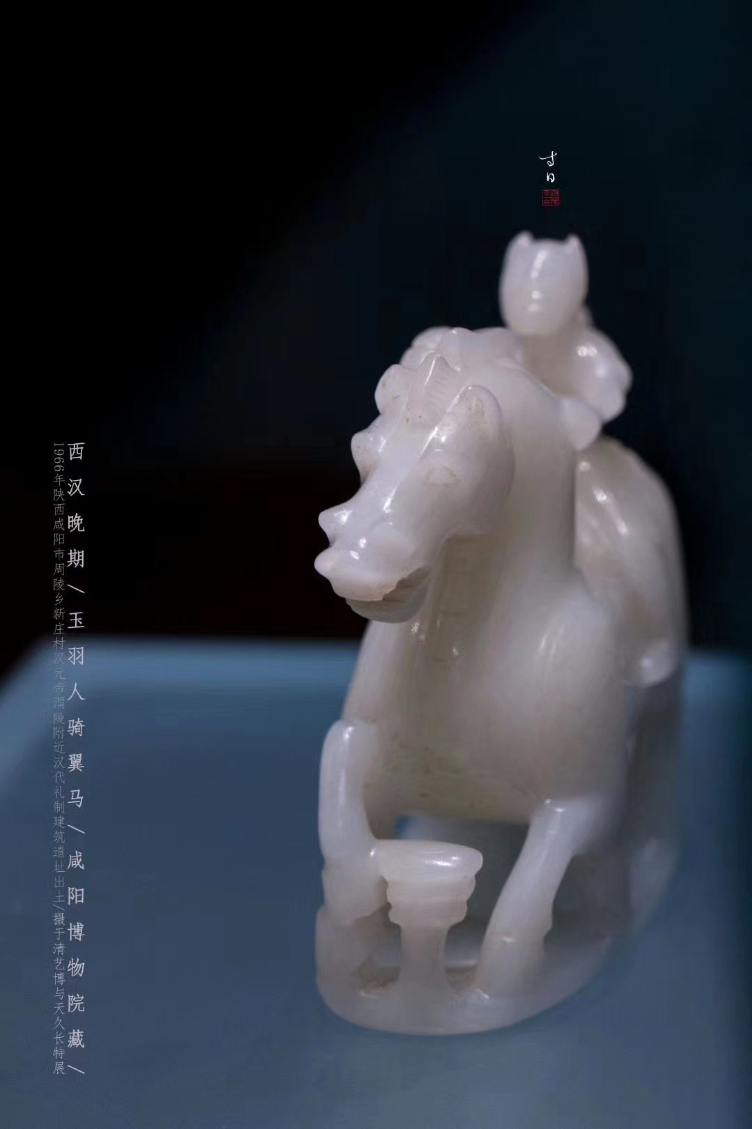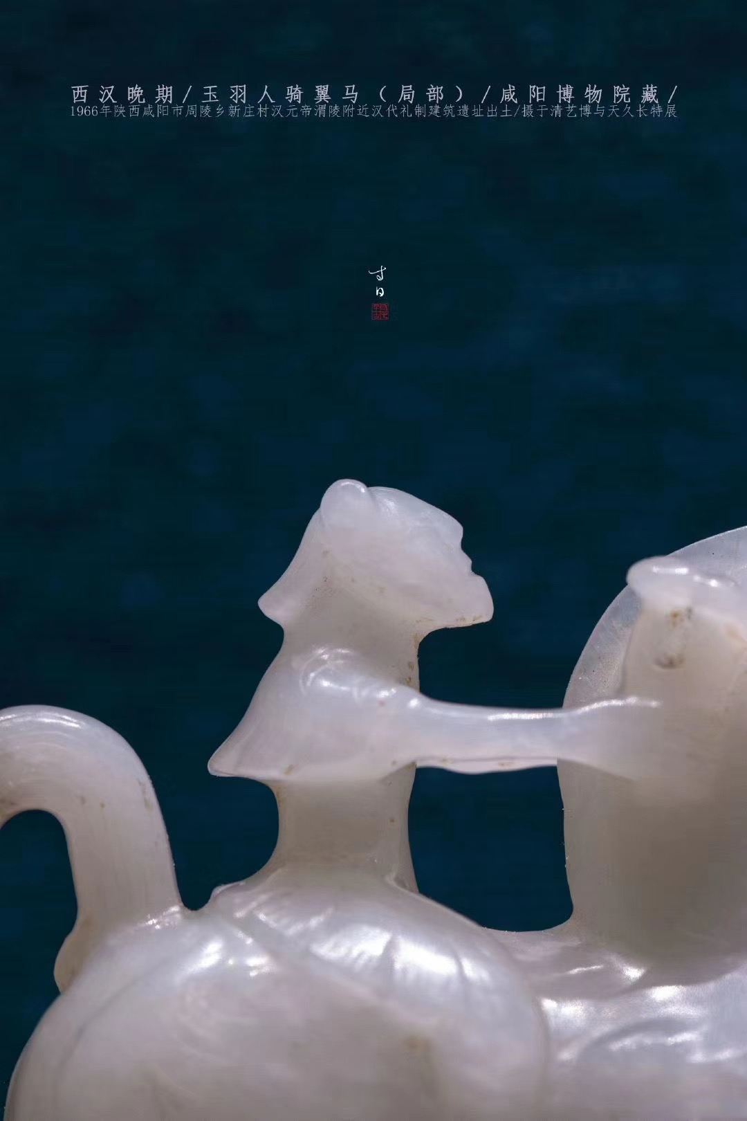 【1966年陕西咸阳汉元帝渭陵礼制建筑遗址出土,高7cm,长8.9cm,底宽3cm,软玉质地。整器造型系圆雕、镂雕而成, 出土时被朱砂包裹, 主体呈一人骑马驰骋奔腾状, 由马、骑者和底座三部分组成。马形体雄壮, 昂首张口, 竖耳挺胸,马身两侧各雕有阳刻飞翼。骑者头微仰起, 高鼻长脸, 双耳过项, 头系软巾, 身着短衣, 双手扶马颈, 左手握缰, 右手持一灵芝草,其身饰羽翼装束, 威武异常,从总体形象推测应为“羽人”。马下长方形踏板上线刻着涌动的祥云, 并和马蹄、马尾融为一体。】